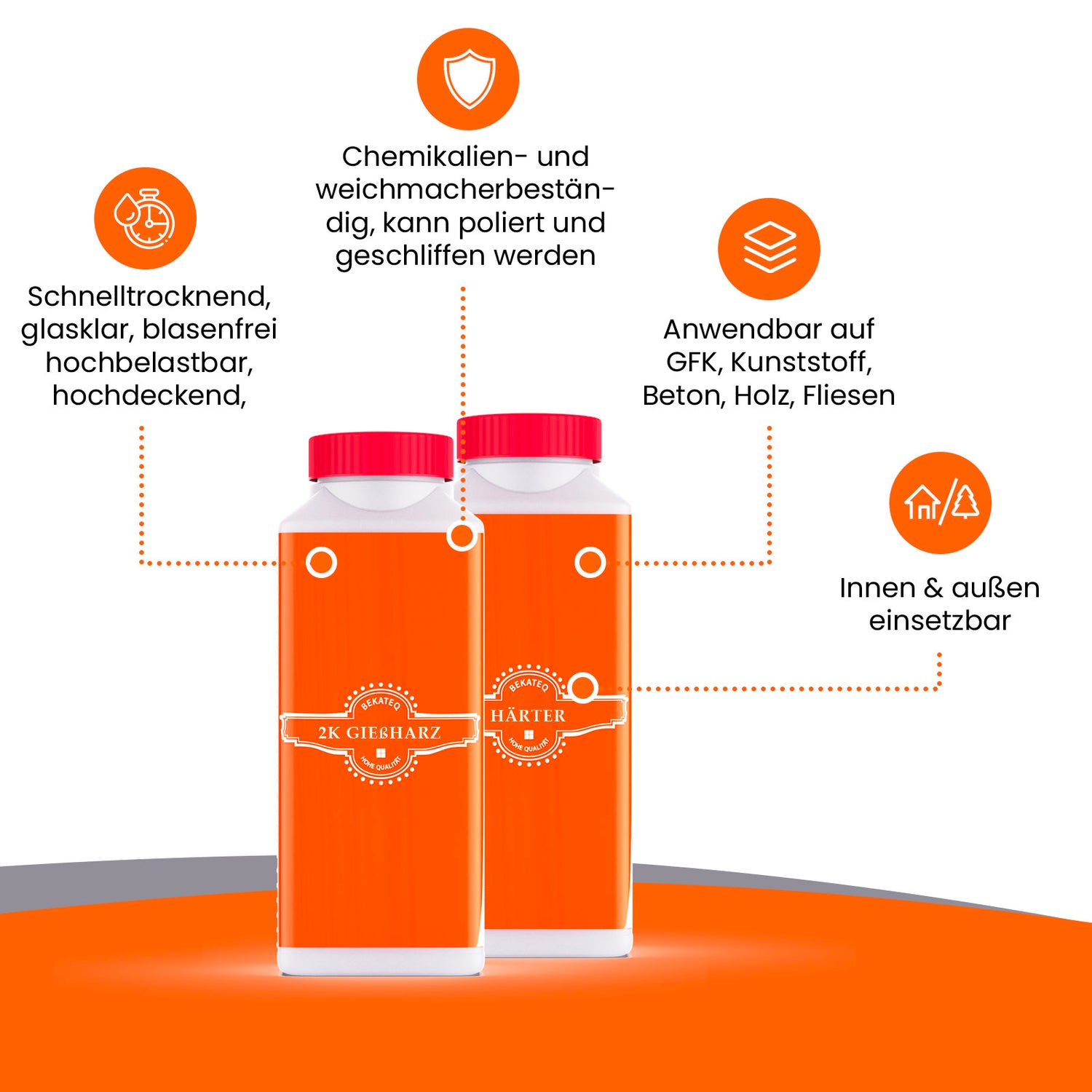 Dank der leichten Verarbeitung und der kurzen Aushärtung ist ein schnelles weiterarbeiten möglich. Auch für den Pool- und Teichbau geeignet. Ideal bei hohen Anforderungen an Festigkeit und Haftung. Herstellung von Faserverbundwerkstoffen, Beschichtungen, Verklebungen und für Gießanwendungen.