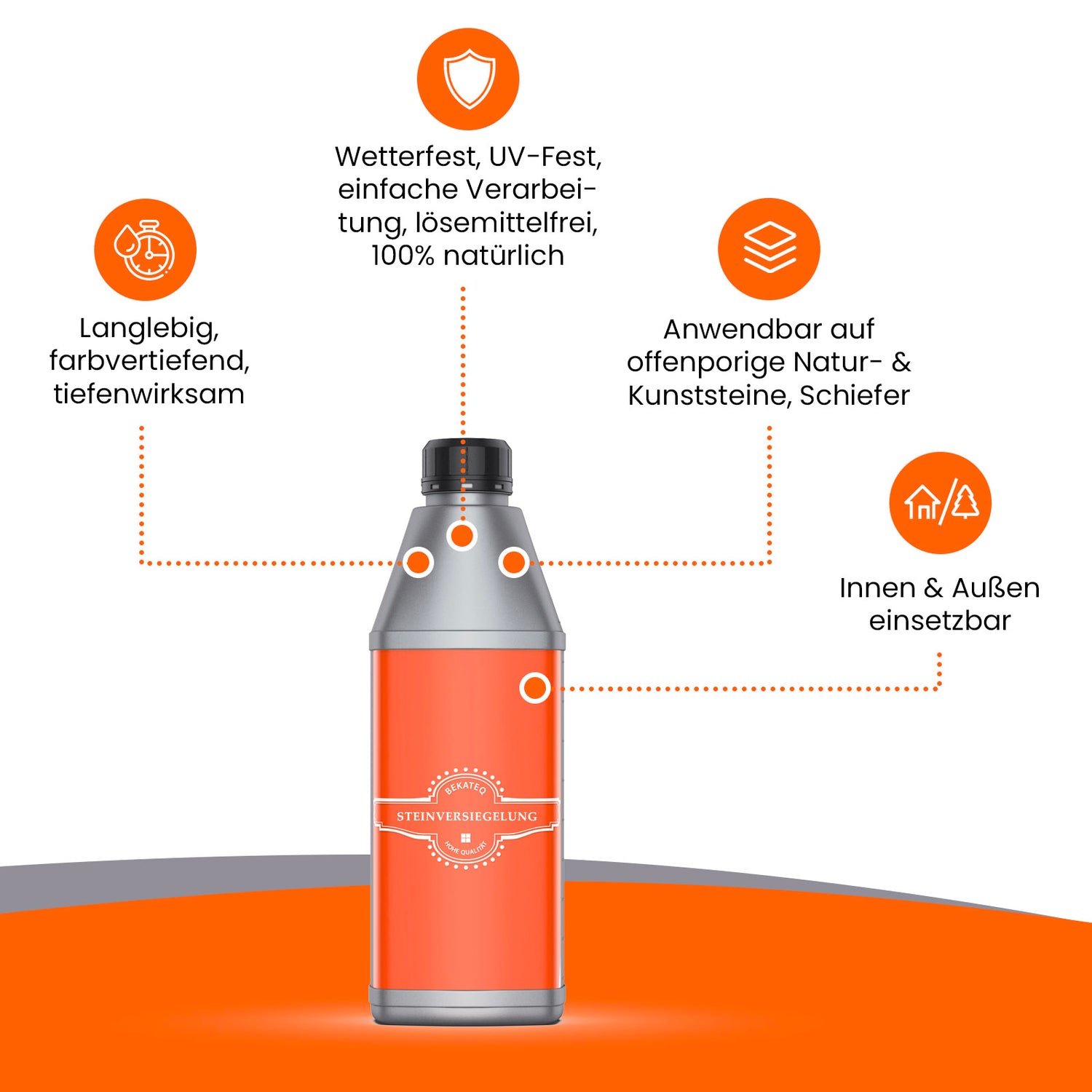 Schutz von Anfang an: Neue Steinoberflächen werden durch einen einmaligen, dünnen Anstrich mit der Bekateq Steinversiegelung perfekt geschützt. Das Produkt wird dabei auf die saubere, fettfreie und vollkommen trockene (!) Steinoberfläche aufgetragen, eventuell überschüssiges Material wird mit einem Tuch entfernt. Nach der vollständigen Aushärtung sind die behandelten Steinoberflächen pflegeleicht, sowie schmutz- und wasserabweisend.