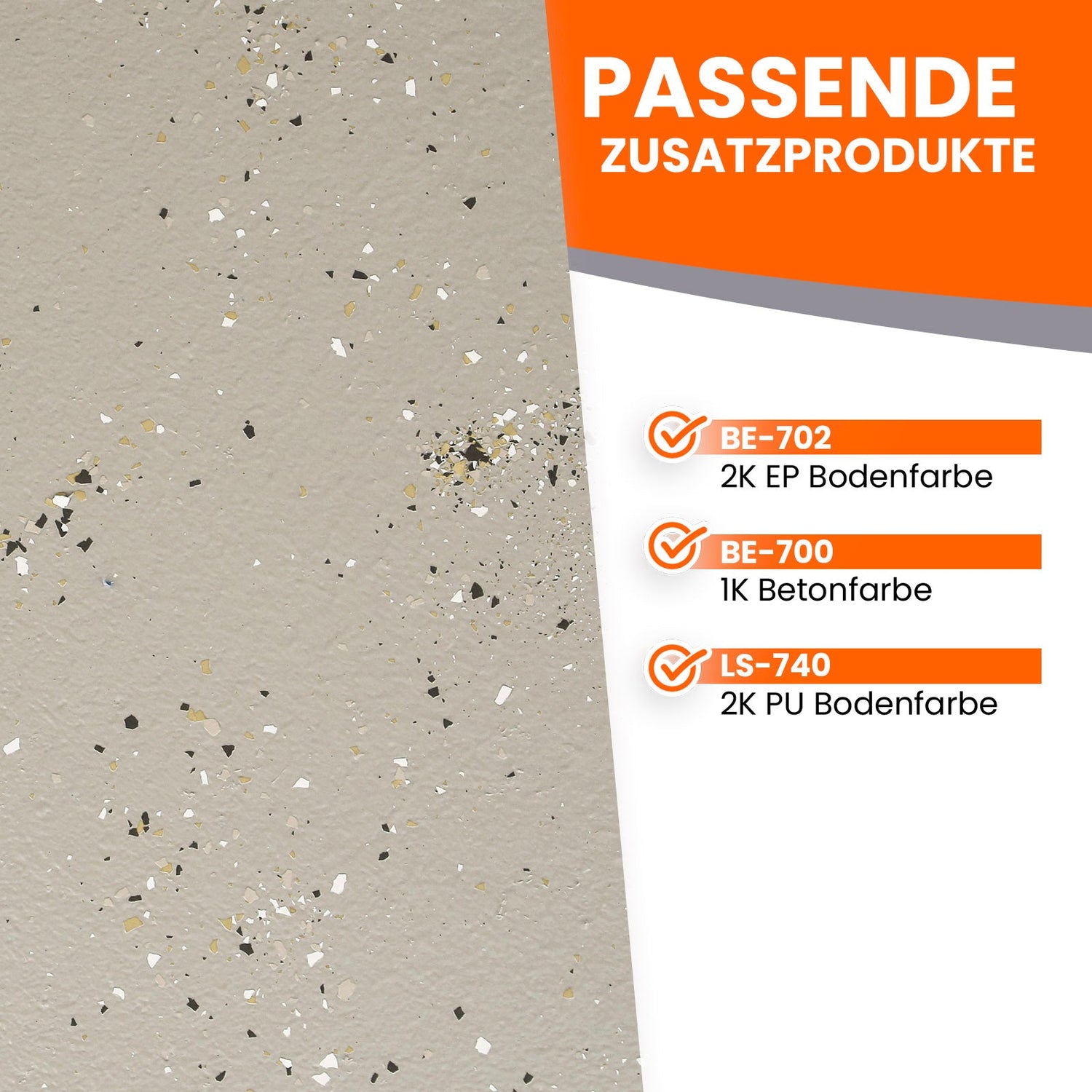 - Der Verbrauch an Farbchips ist bei Versiegelungen (Verbrauch bei 0,3kg pro m²) als Untergrund an den unteren Werten zu berechnen und bei selbstverlaufenden Beschichtungen (2-3mm) an den oberen Werten.