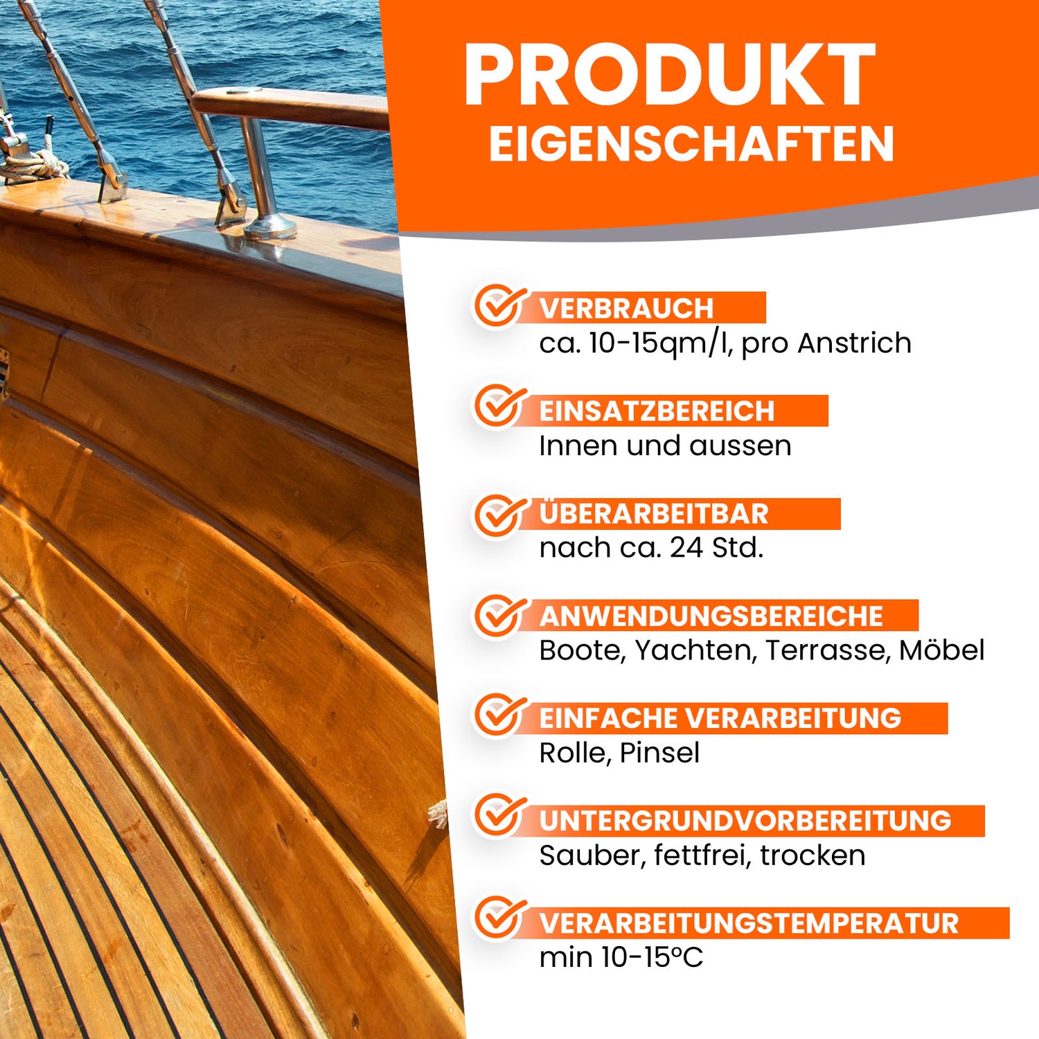 Teak & Yachtöl eignet sich für nahezu alle Hart- und Tropenhölzer wie Bangkirai, Eiche, Esche, Lärche, Mahagoni, Teak uvm.