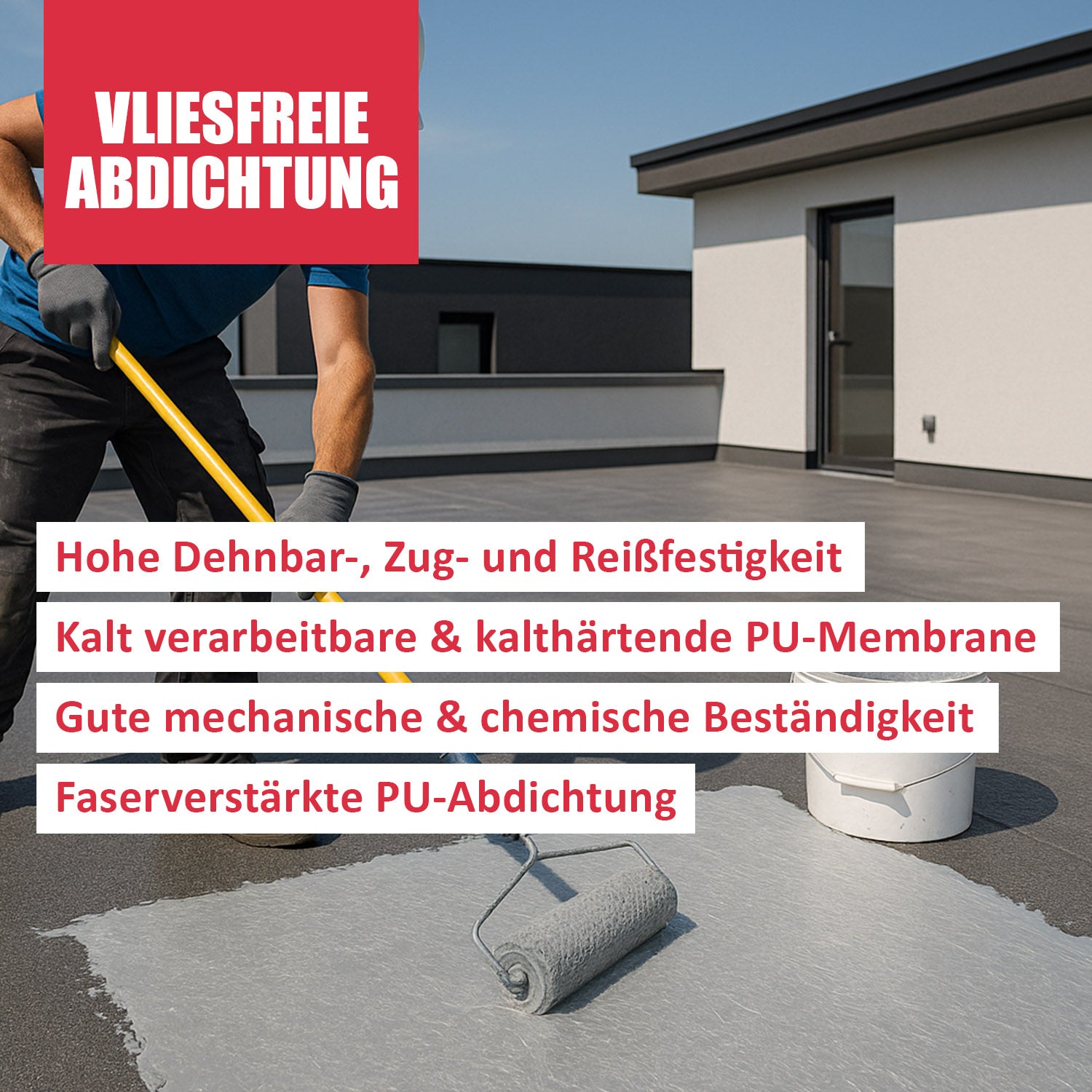 Schnellhärtender, lösemittelhaltiger, faserarmierter, 1K Polyurethan Flüssigkunststoff der neuesten Generation mit enthaltener Glasfaserverstärkung. Zur vliesfreien Detailabdichtung im Außenbereich. Die "Humidity Activated Accellerator" Technologie ermöglich eine blasenfreie, kalt verarbeitbare und kalthärtende Polyurethan-Membrane.