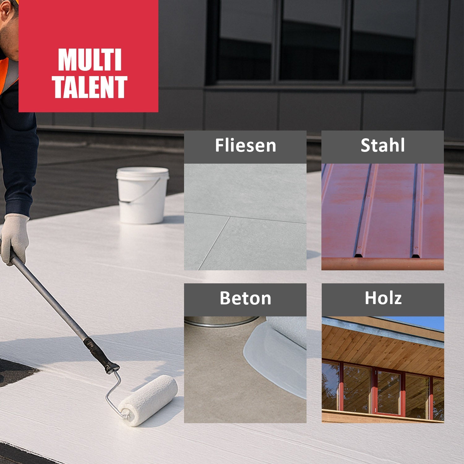 Abdichtung für Flachdächer und andere Oberflächen auf Beton, Estrich, Stahlbeton, Stahl, Edelstahl, Fliesen, Bitumen* und Folien Sanierung (EPDM, PVC FPO / TPO) sowie als Abdichtung und Detailabdichtung für Balkone, Terrassen, im Holzbau, für Geländerstützen etc.