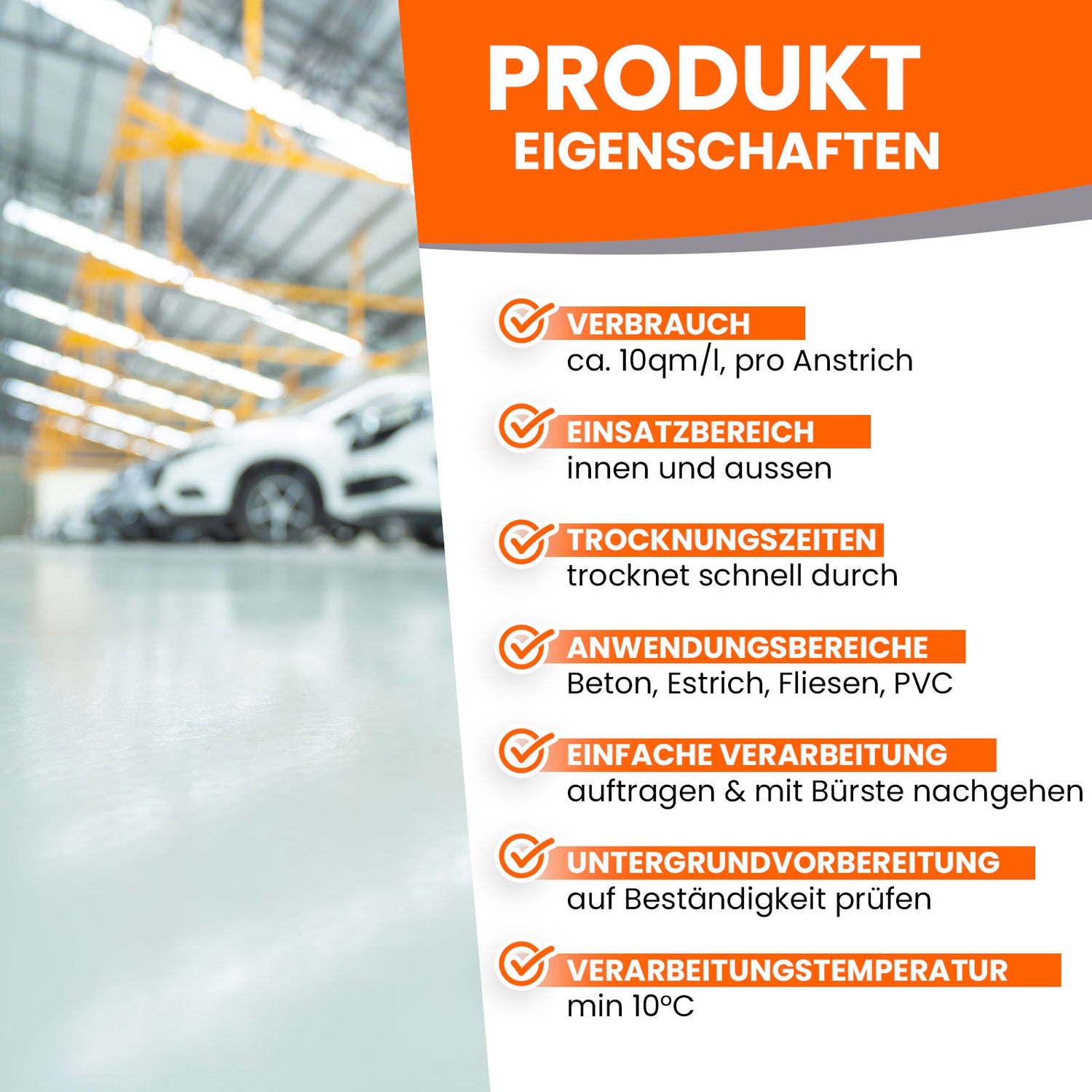 Der Bodenreiniger besteht aus einer speziellen Zusammensetzung, die Dank der Formel für einen sauberen und fettfreien Betonuntergrund sorgt. Bei der Beschichtung mit unserer Betonfarbe ist eine optimale Untergrundvorbereitung von enormer Bedeutung, welche im ersten Schritt erfolgen sollte. Der Bodenreiniger kann dabei sowohl auf älteren und ölverschmutzten als auch auf neuen Böden zum Einsatz kommen.