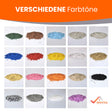 -Der Verbrauch an Farbchips ist bei Versiegelungen (Verbrauch bei 0,3kg pro m²) als Untergrund an den unteren Werten zu berechnen und bei selbstverlaufenden Beschichtungen (2-3mm) an den oberen Werten.